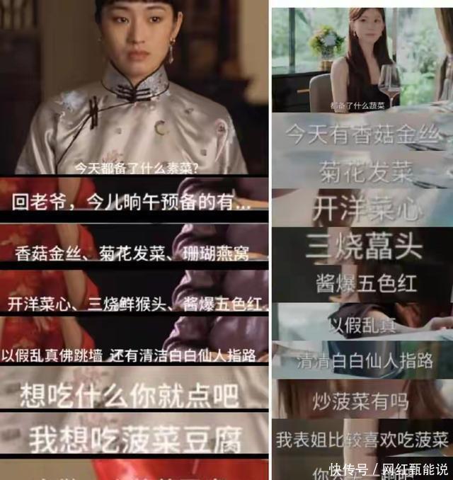 甚至还抄到张艺谋的头上,女主带姐姐和男主吃饭,报菜名报了一堆高深莫测的菜来显示姐姐的寒酸,而这些菜名呢全部来自张艺谋的《大红灯笼高高挂》。