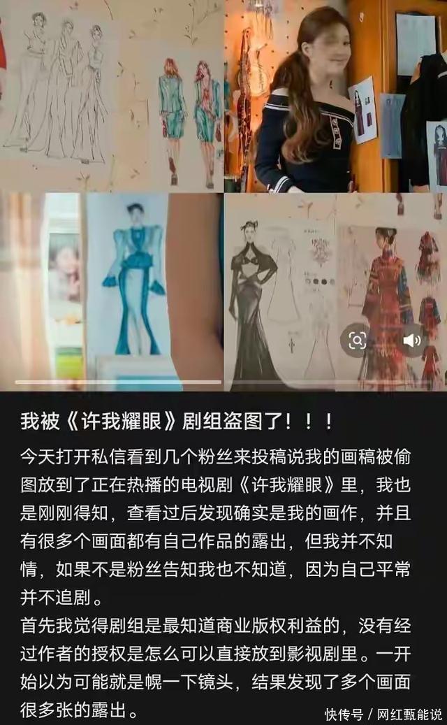 自己都光明正大地抄袭竟然还好意思下场内涵,真是内娱很久没有见过这么low的女明星了。 更搞笑的是,《许我耀眼》之前在网络上被素人铺天盖地地维权。从画作、服装设计图纸、旅拍照片甚至是冰箱上贴的食谱都是素人的原创作品,有些甚至还是商业稿件,都被赵露思团队直接拿来用了。